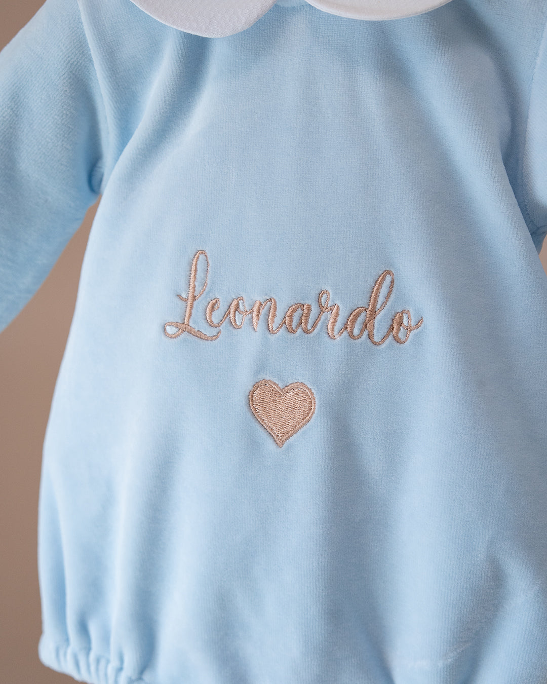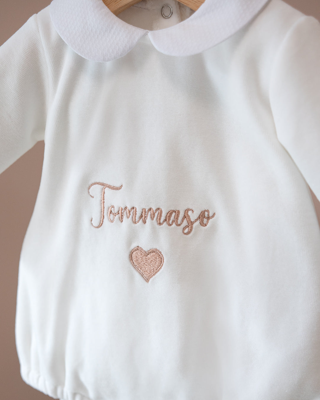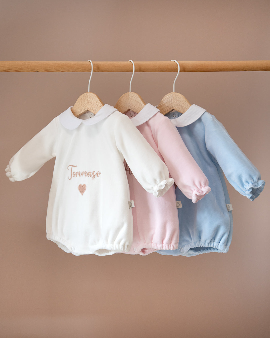 I nostri pagliaccetti sono ricamati una ad una dalle nostre artigiane con il nome del bambino e la decorazione che hai scelto.