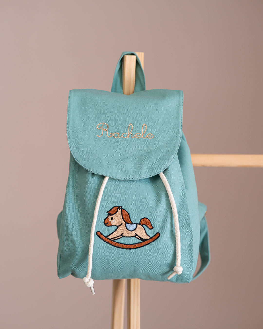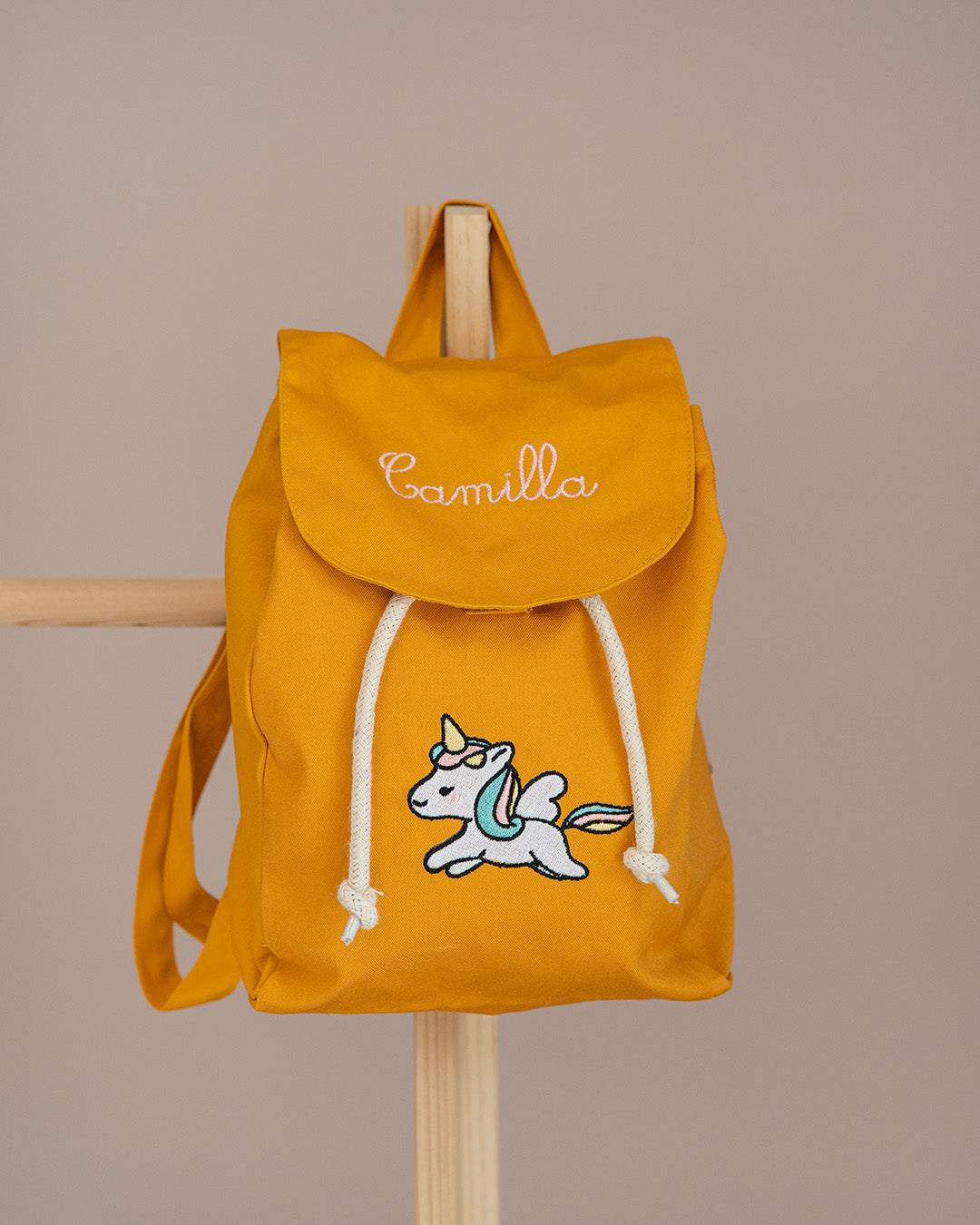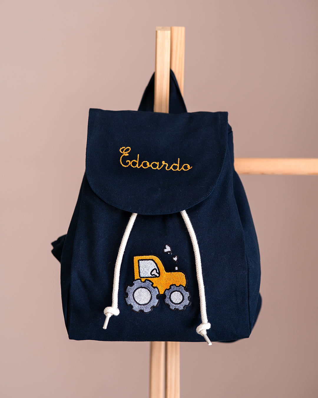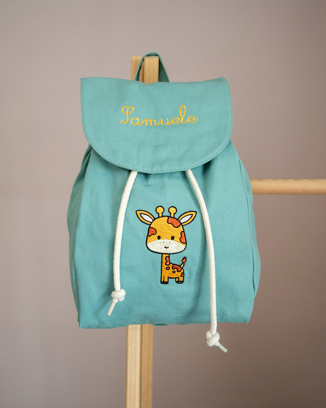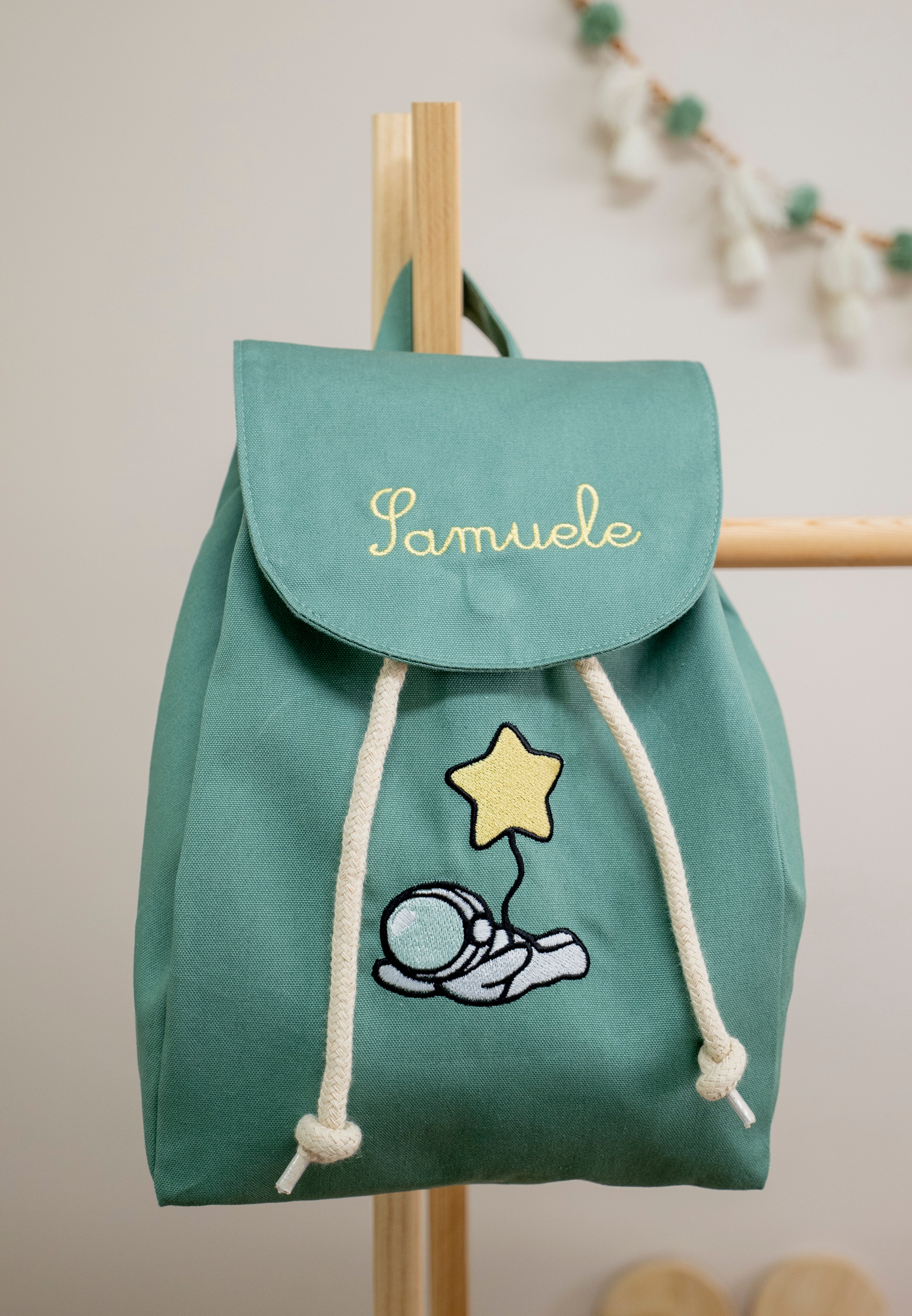 Ogni zaino può essere personalizzato con il nome e il design scelto che viene ricamato esclusivamente su ordinazione in modo artigianale. Il materiale scelto per lo zaino è cotone biologico certificato OCS.