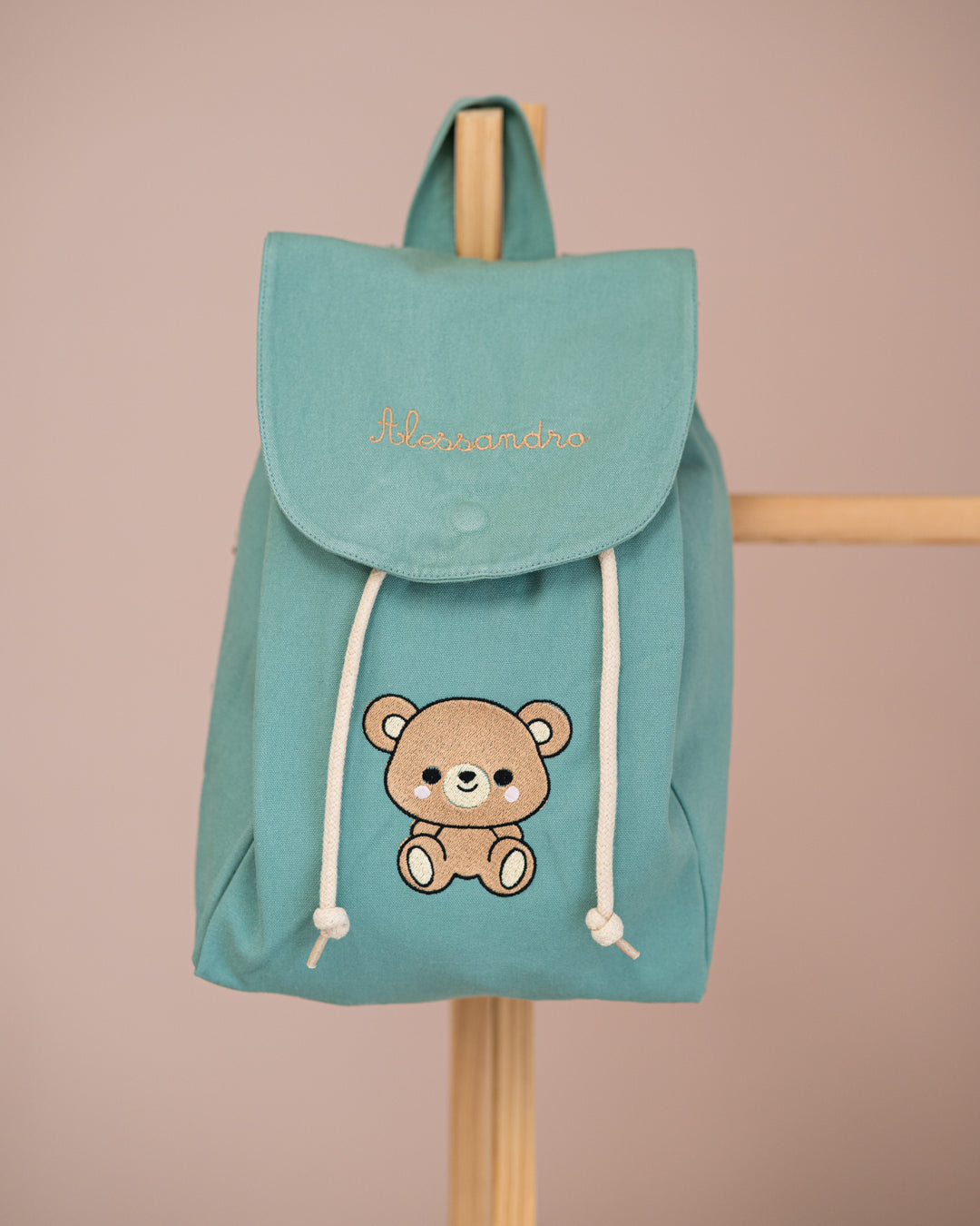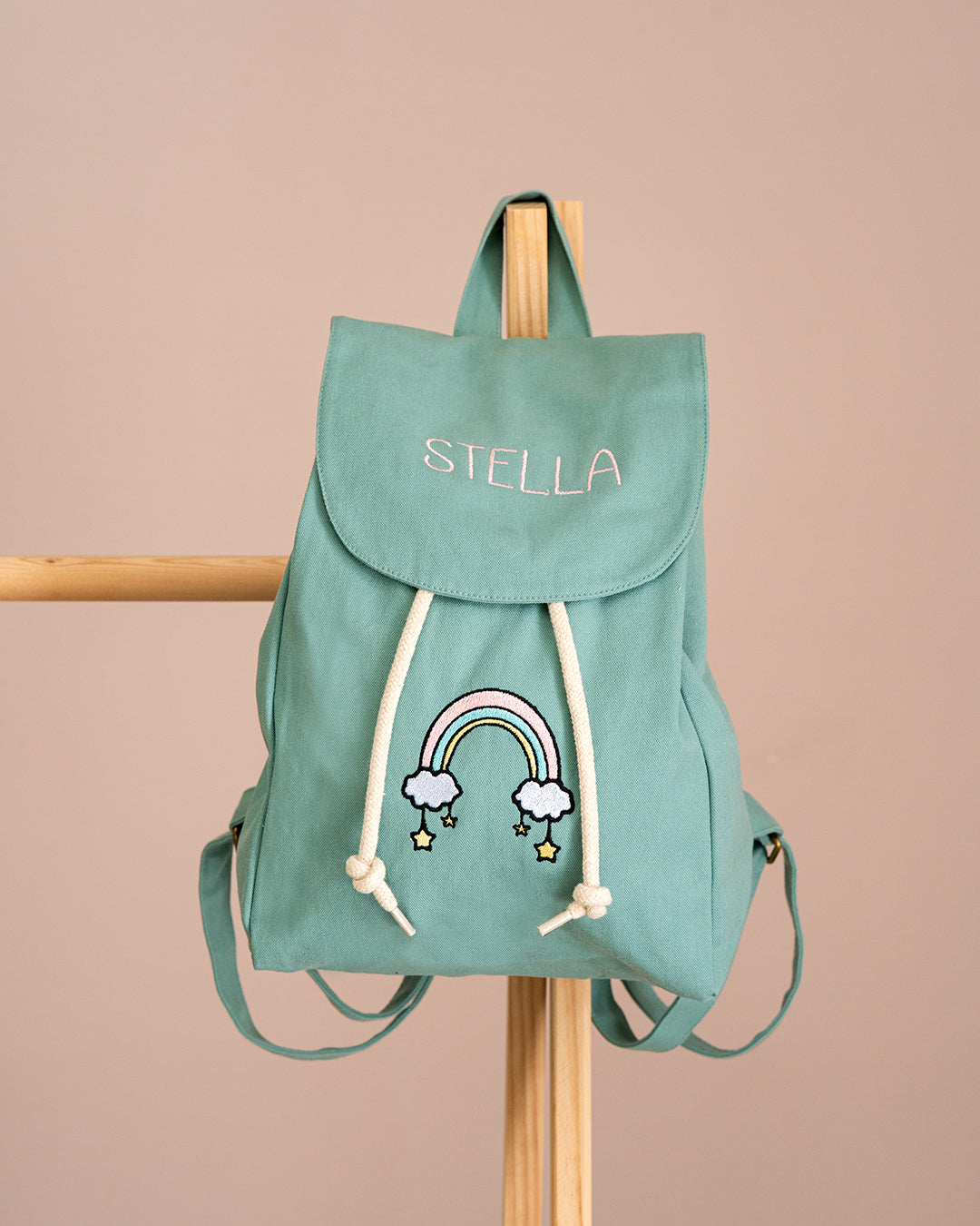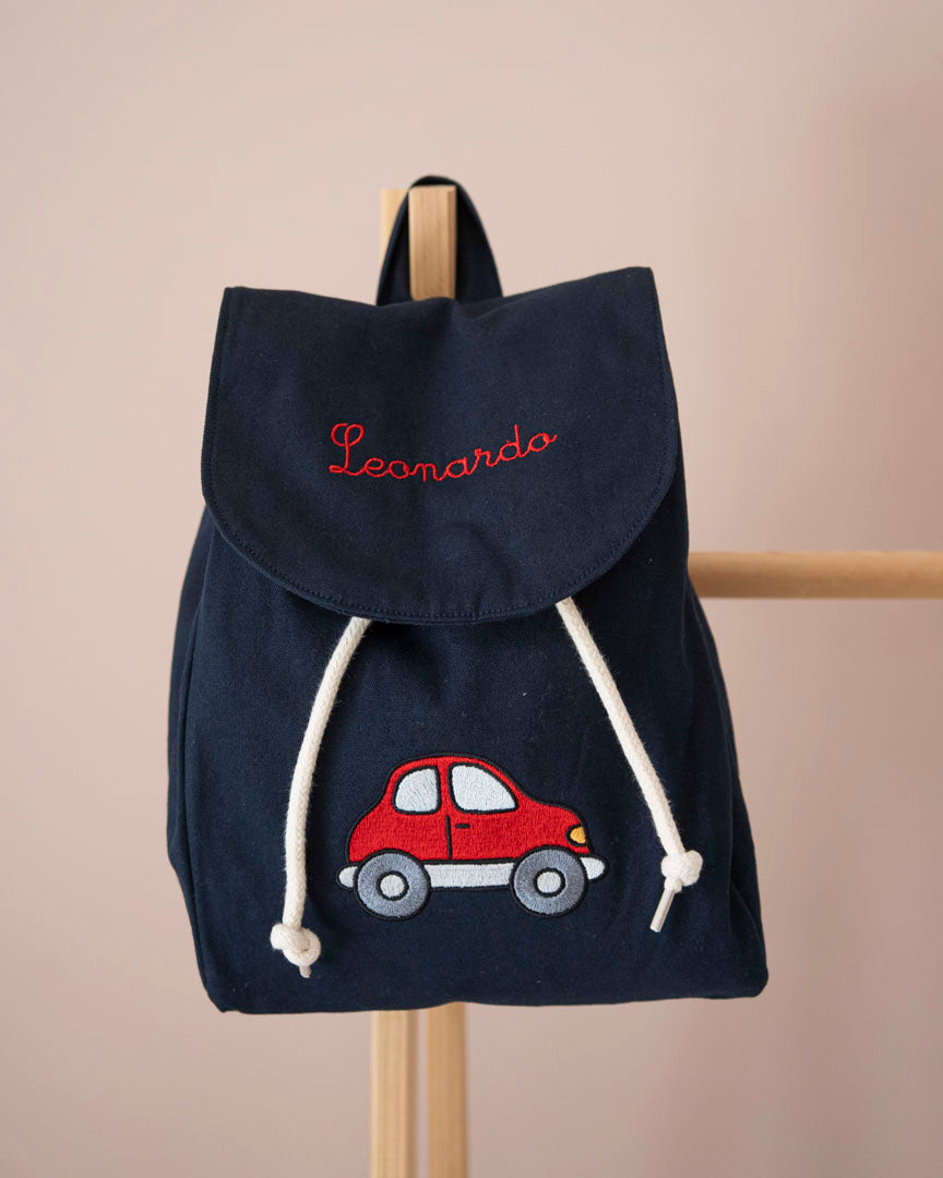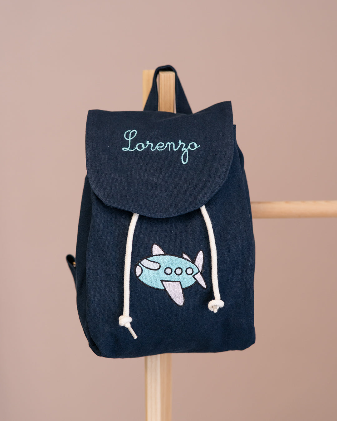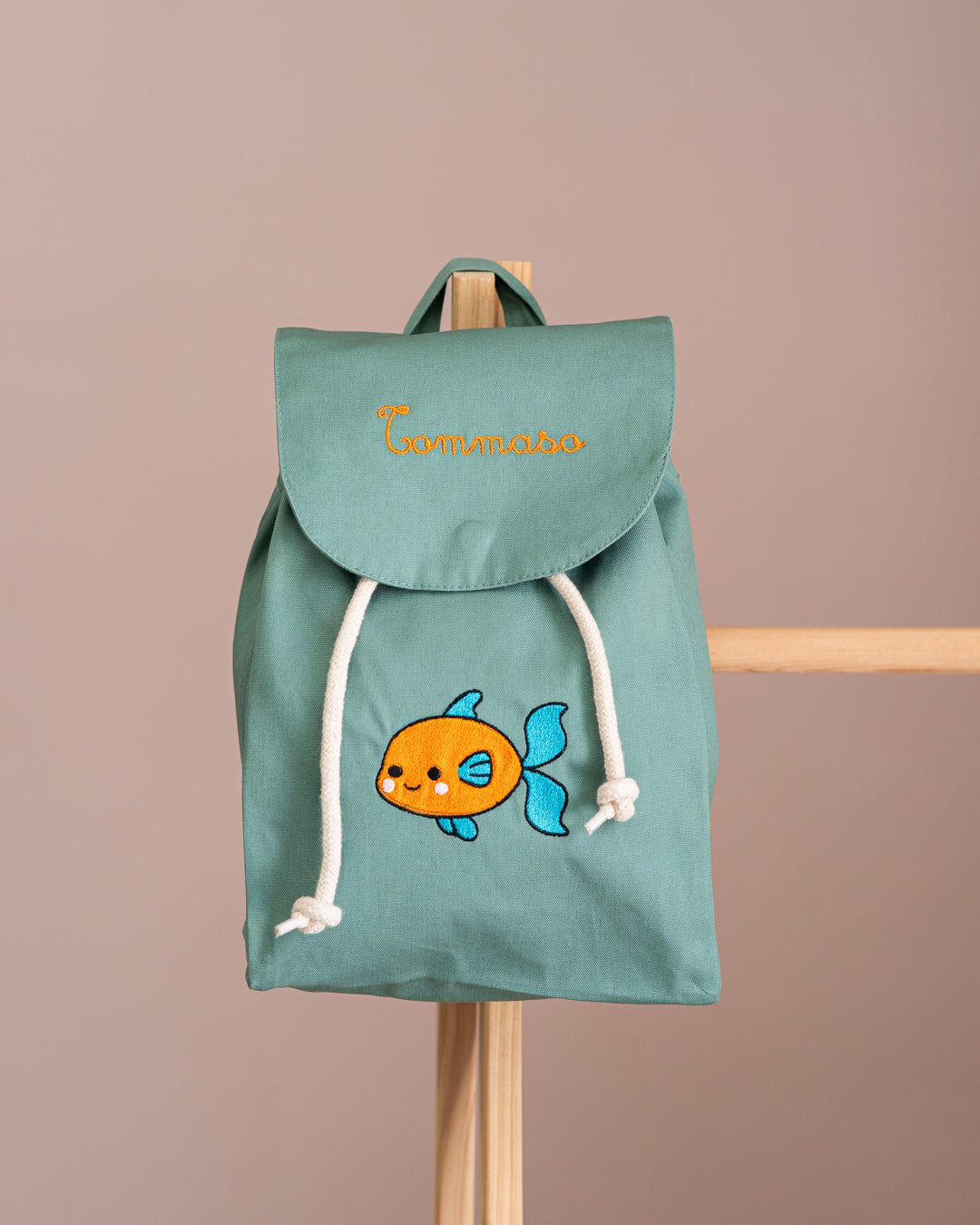 Ogni zaino può essere personalizzato con il nome e il design scelto che viene ricamato esclusivamente su ordinazione in modo artigianale. Il materiale scelto per lo zaino è cotone biologico certificato OCS.