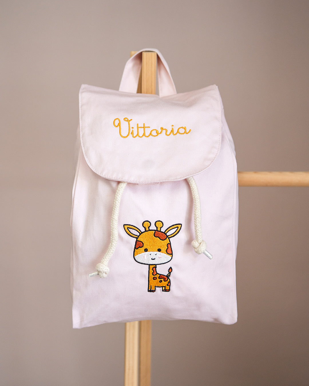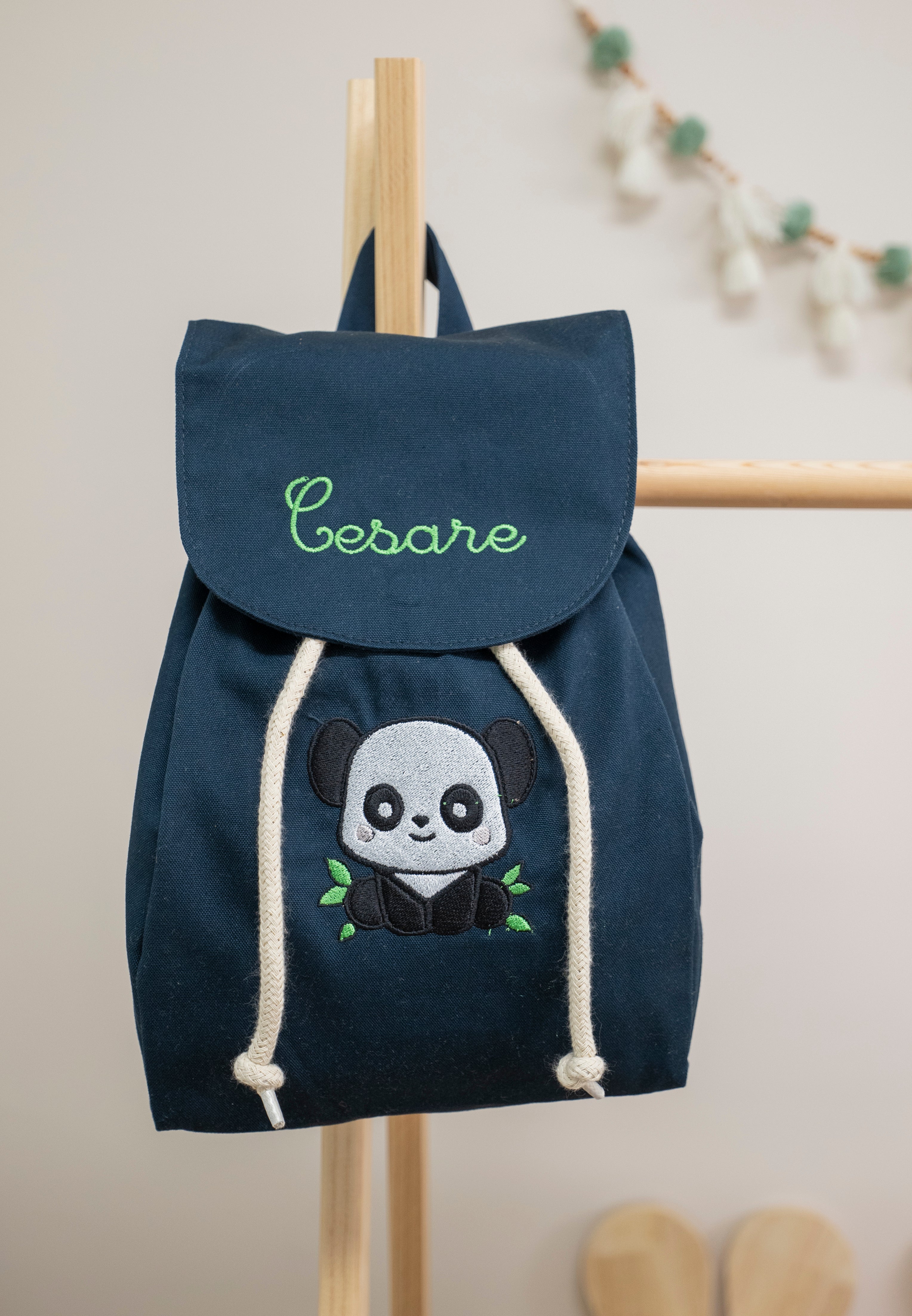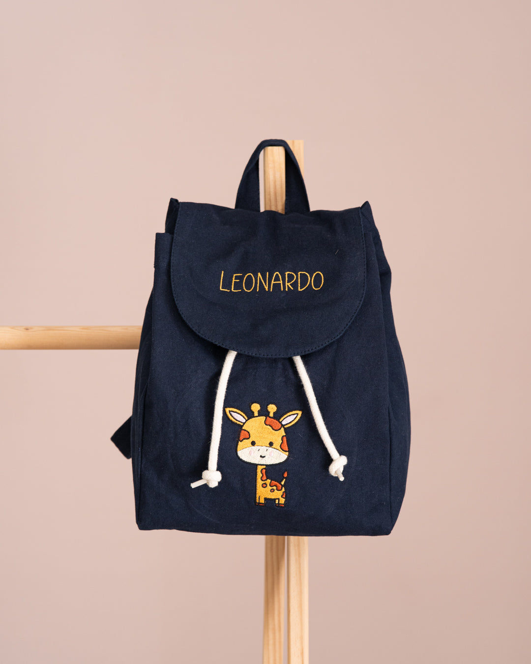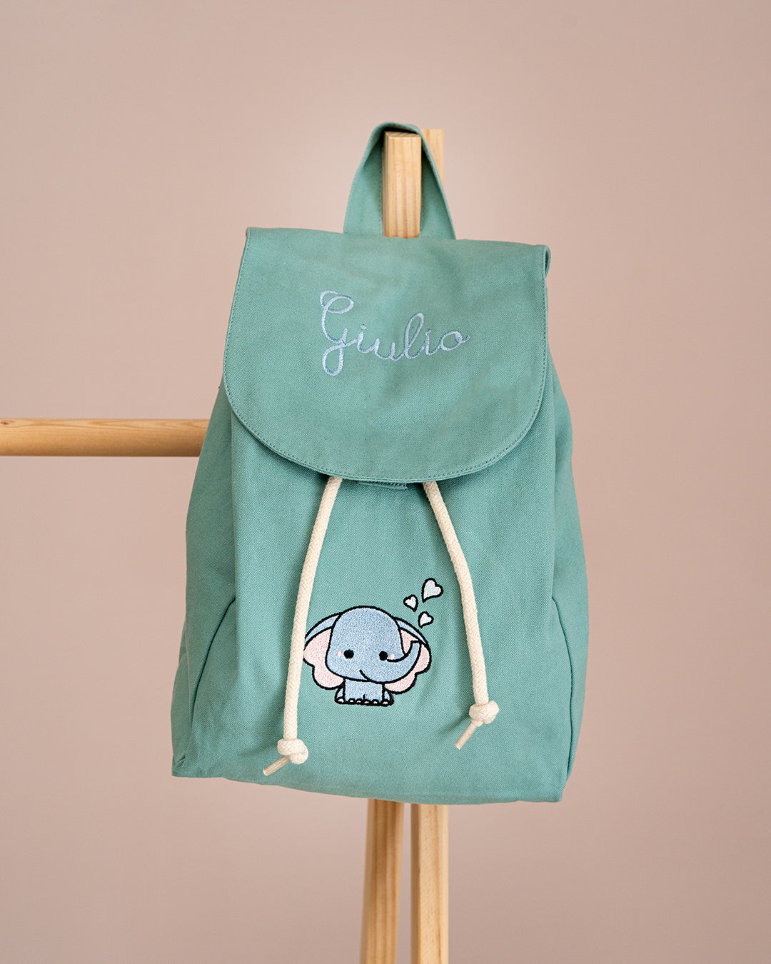 Ogni zaino può essere personalizzato con il nome e il design scelto che viene ricamato esclusivamente su ordinazione in modo artigianale. Il materiale scelto per lo zaino è cotone biologico certificato OCS.