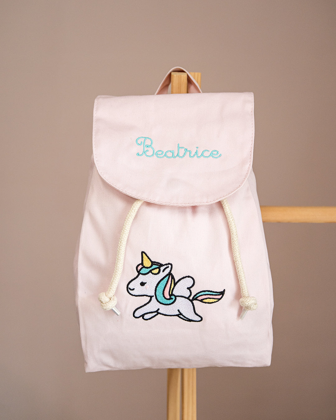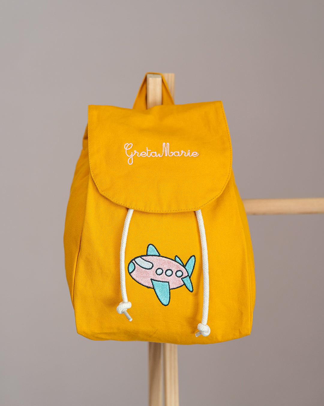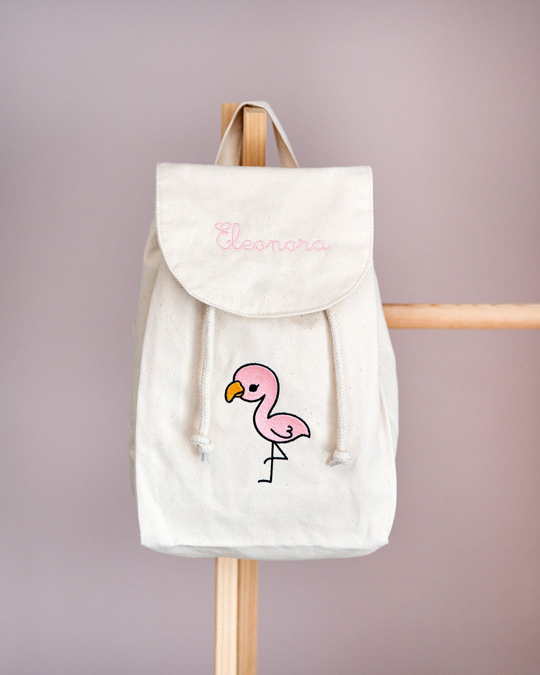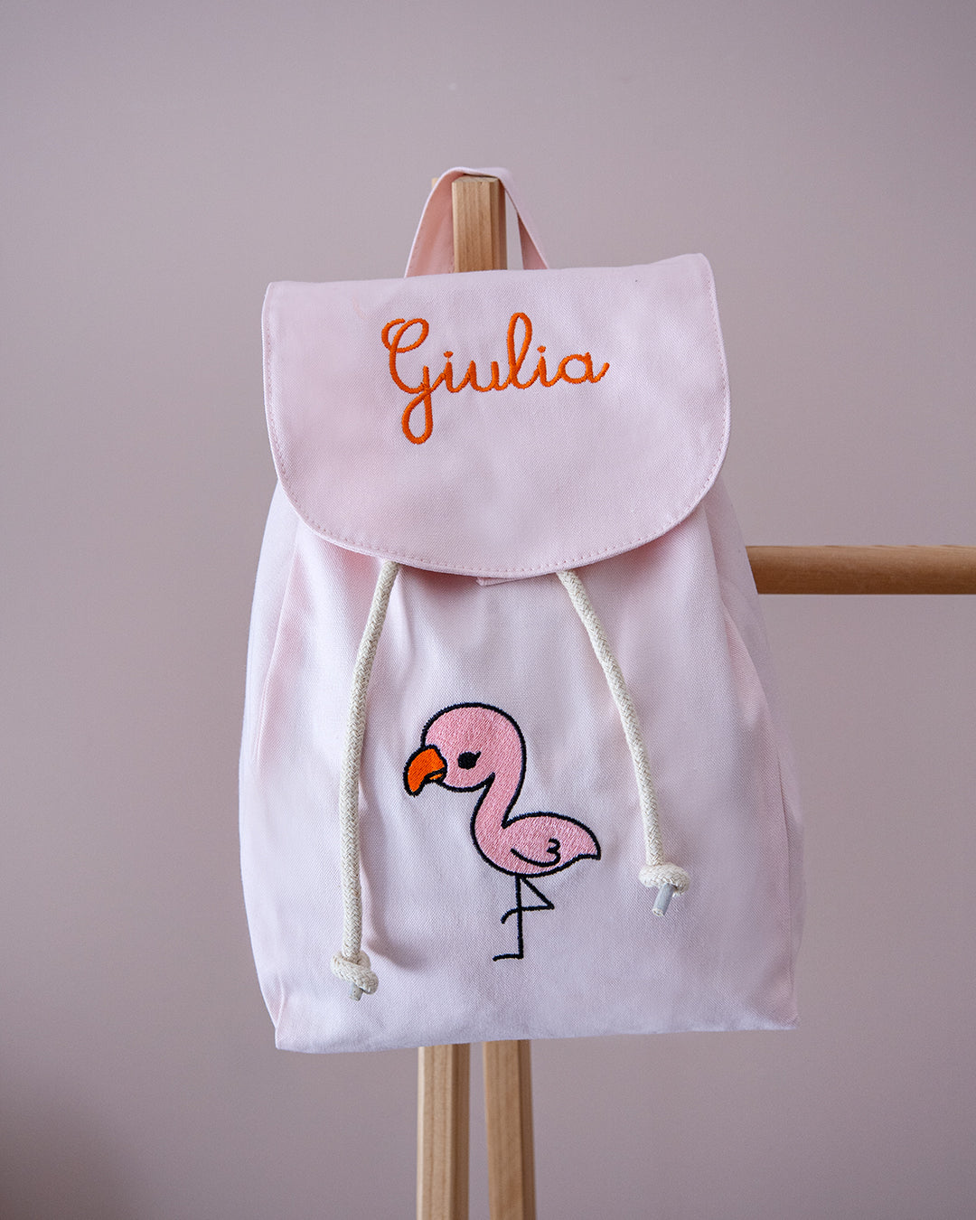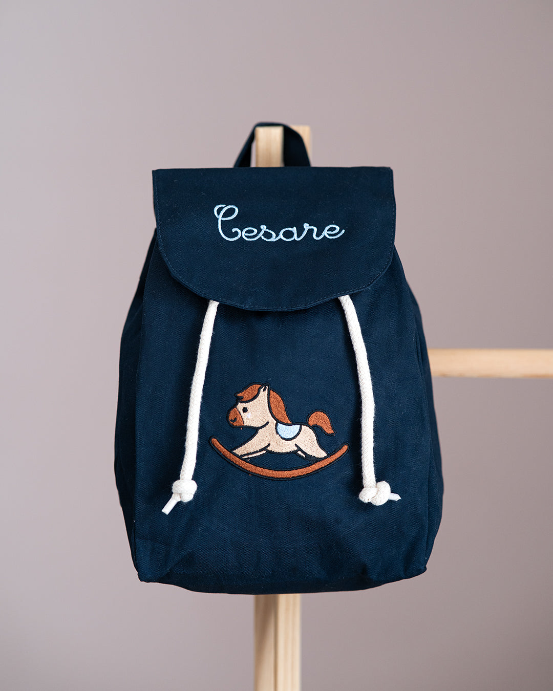 Ogni zaino può essere personalizzato con il nome e il design scelto che viene ricamato esclusivamente su ordinazione in modo artigianale. Il materiale scelto per lo zaino è cotone biologico certificato OCS.
