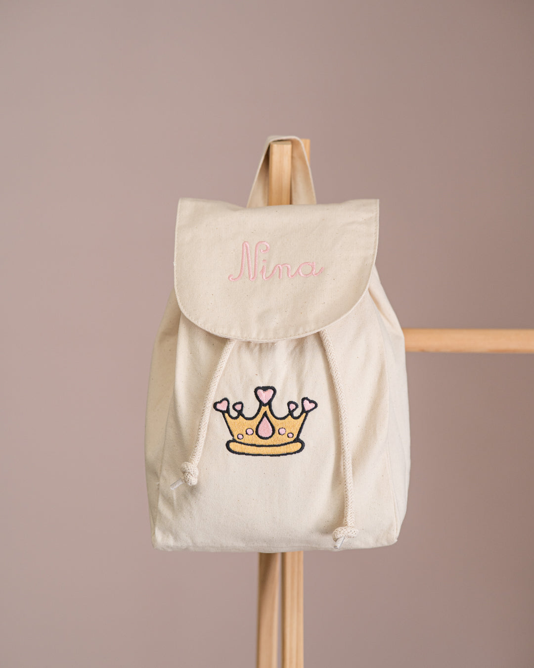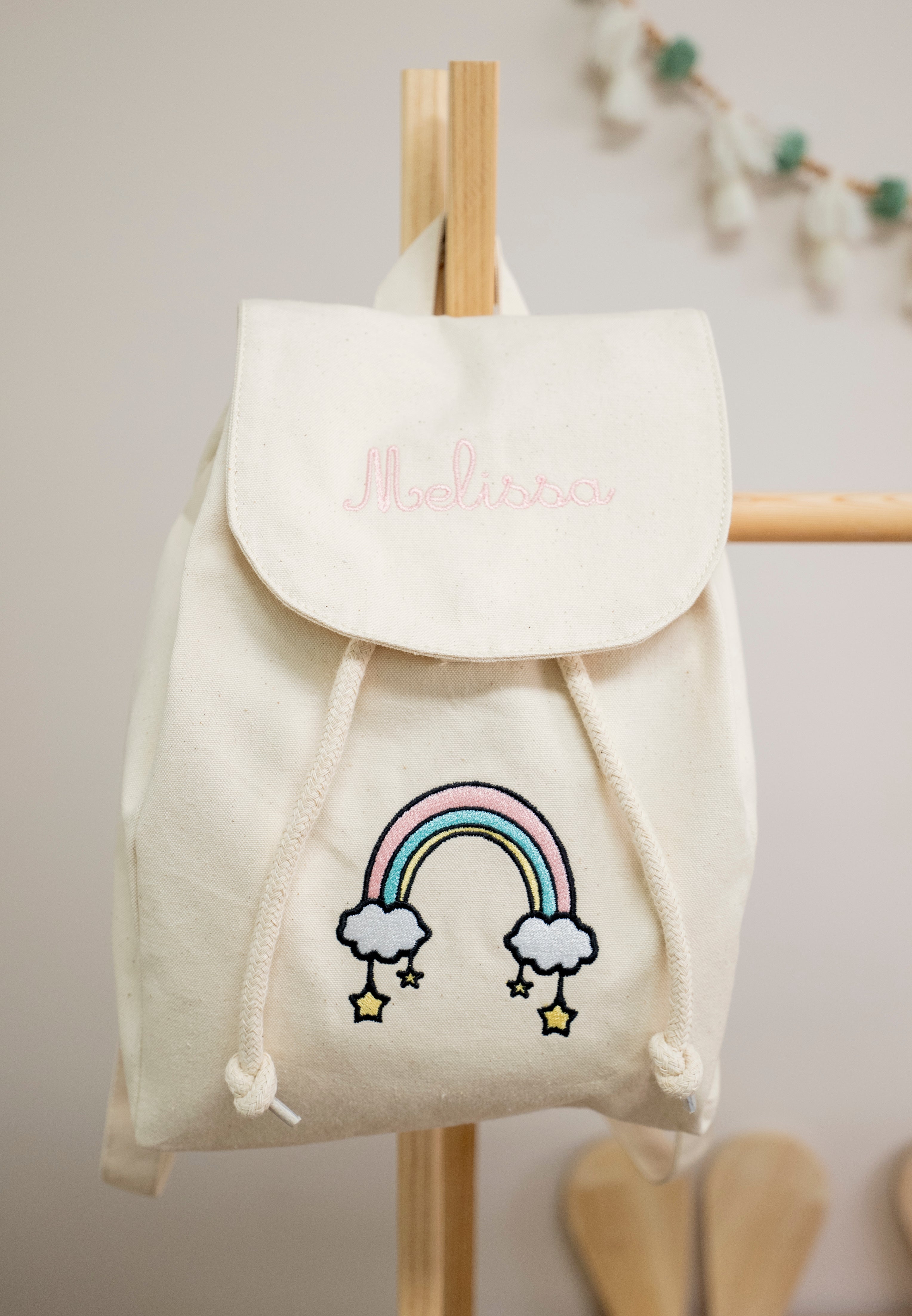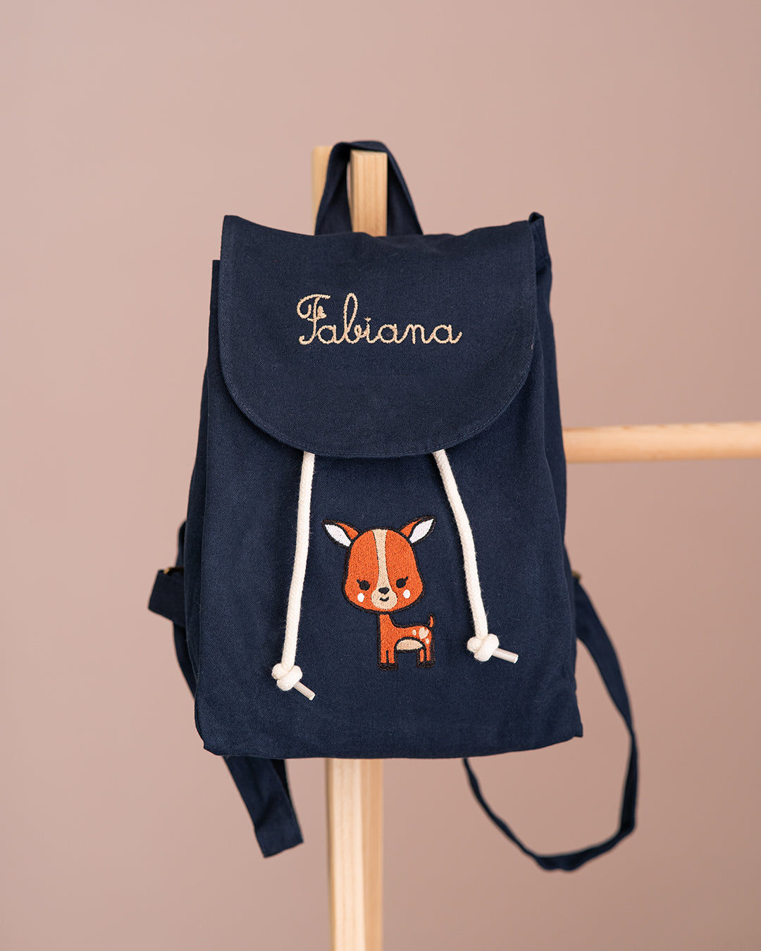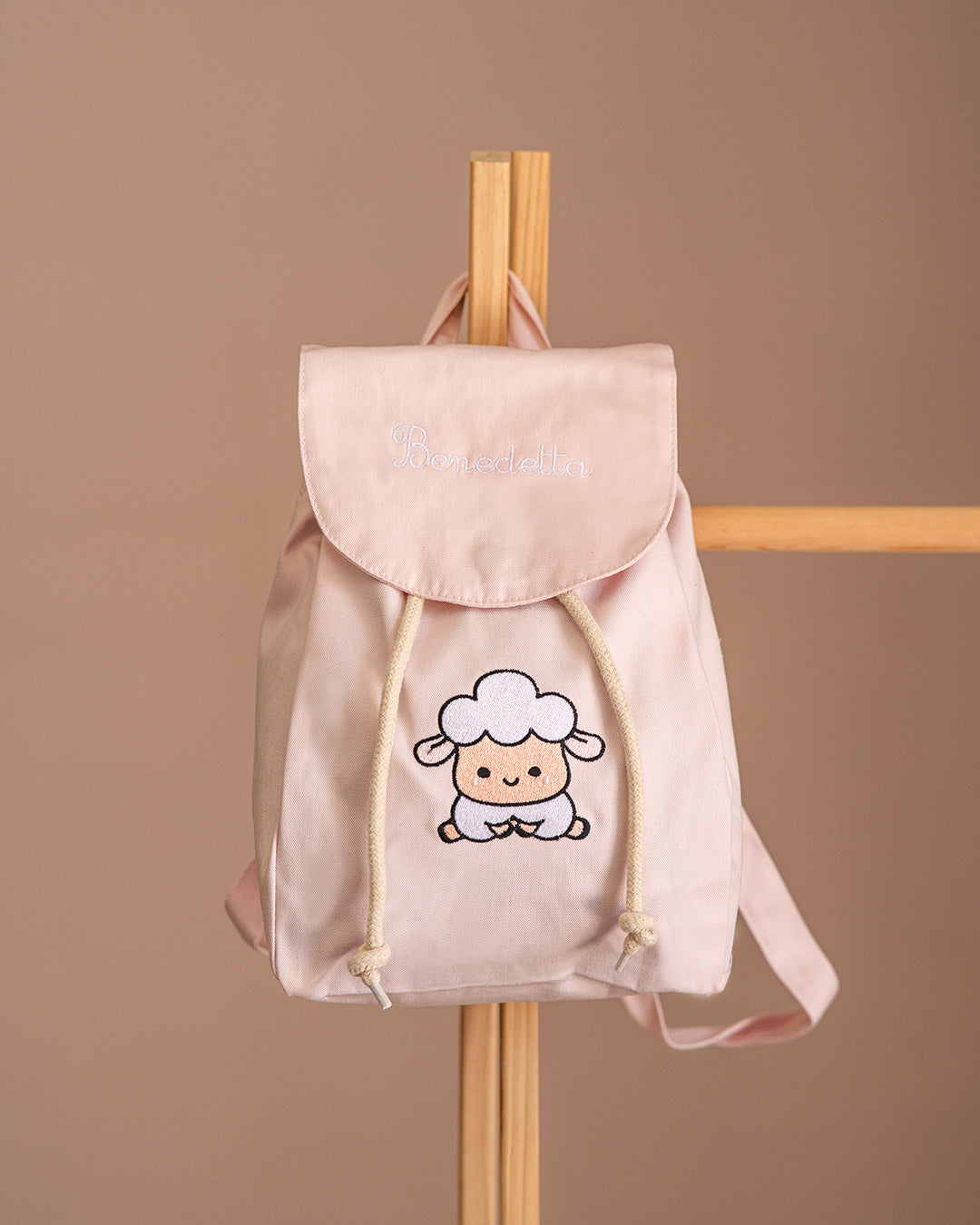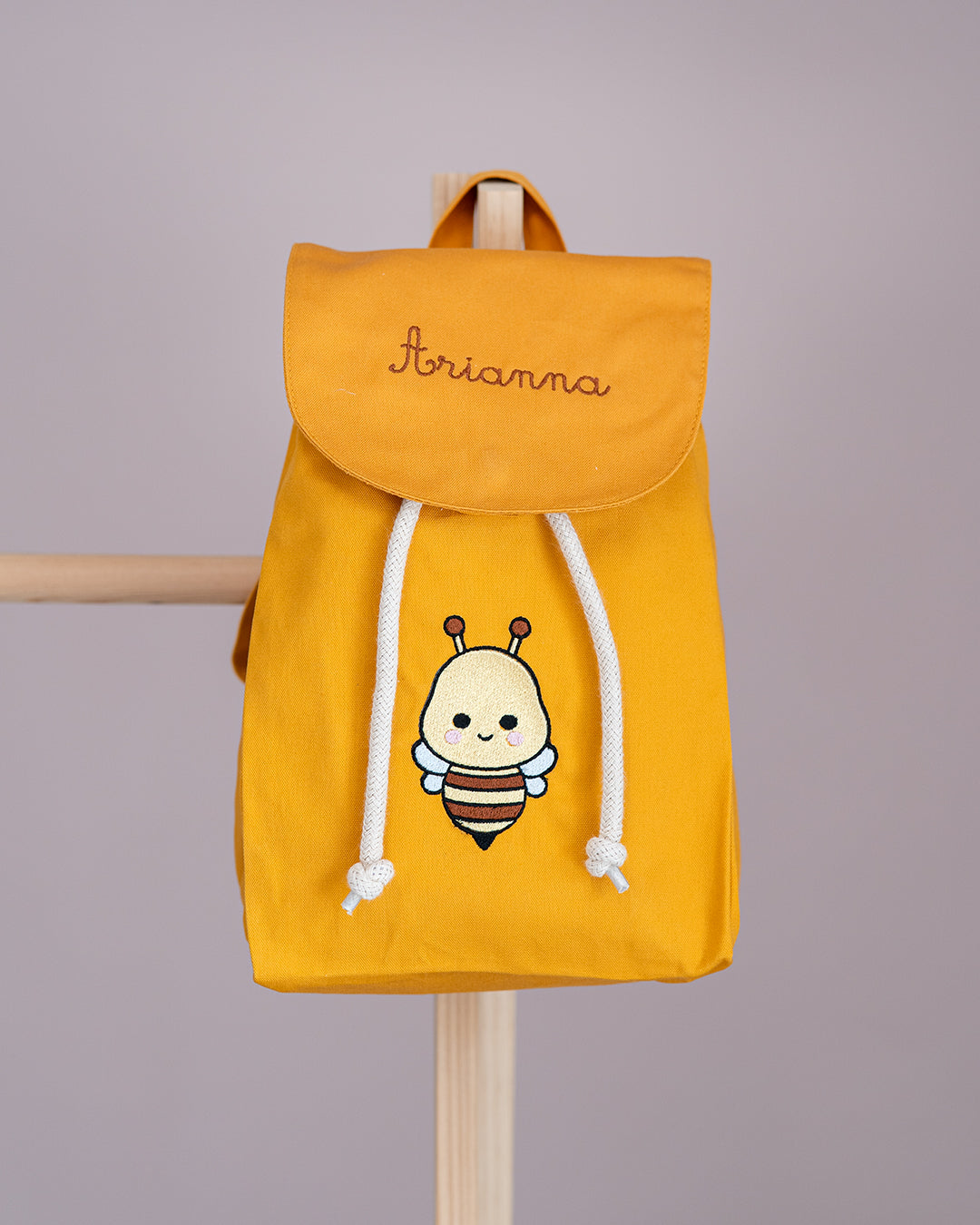 Ogni zaino può essere personalizzato con il nome e il design scelto che viene ricamato esclusivamente su ordinazione in modo artigianale. Il materiale scelto per lo zaino è cotone biologico certificato OCS.