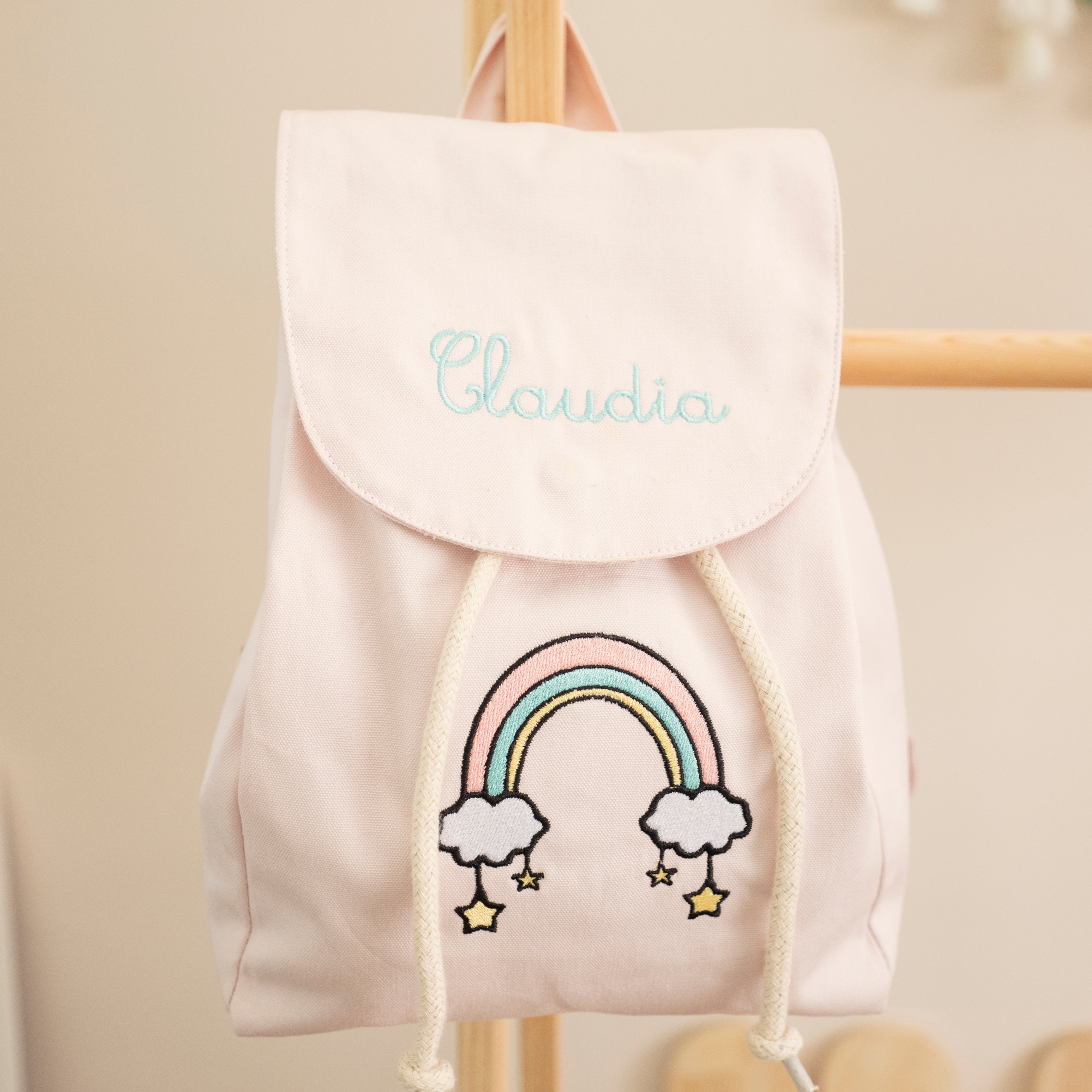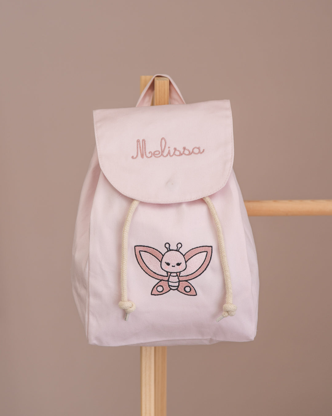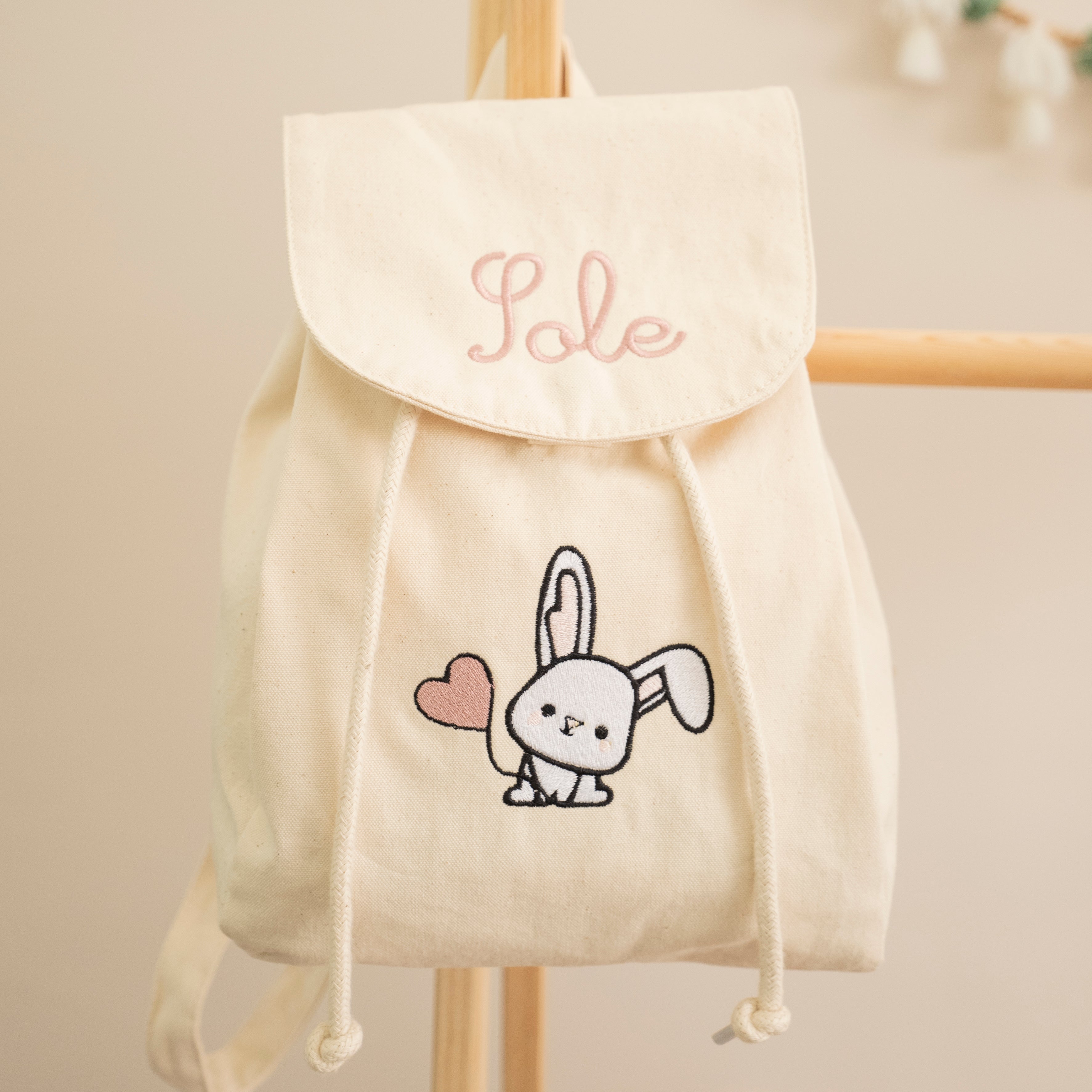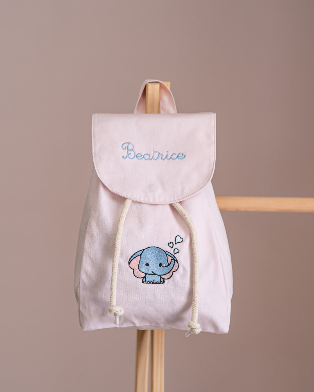 Ogni zaino può essere personalizzato con il nome e il design scelto che viene ricamato esclusivamente su ordinazione in modo artigianale. Il materiale scelto per lo zaino è cotone biologico certificato OCS.