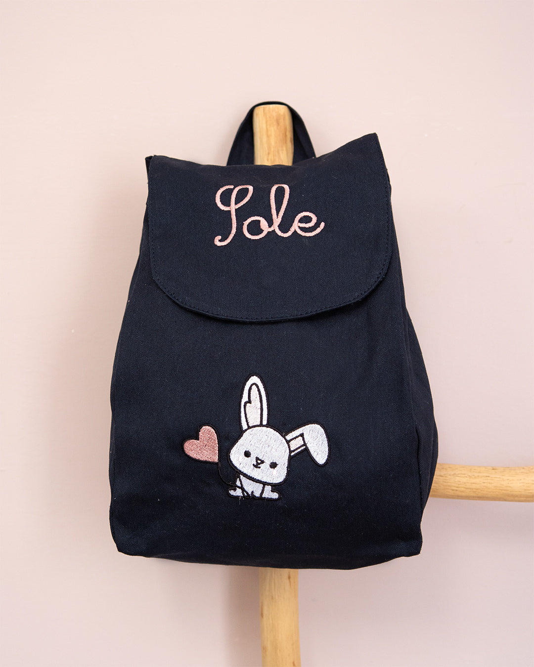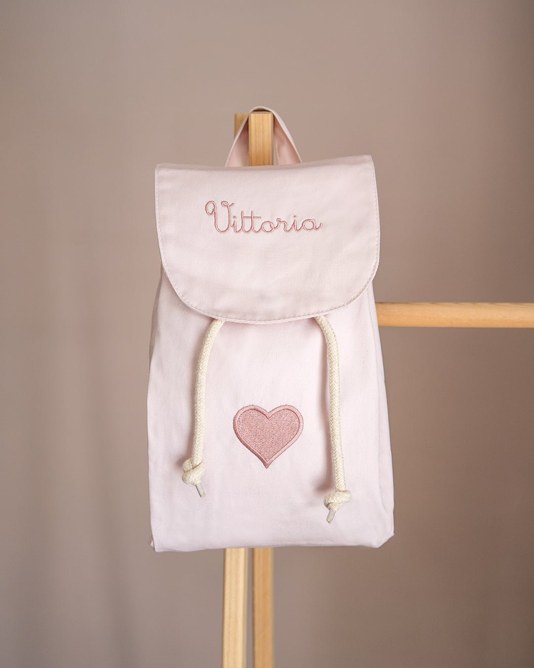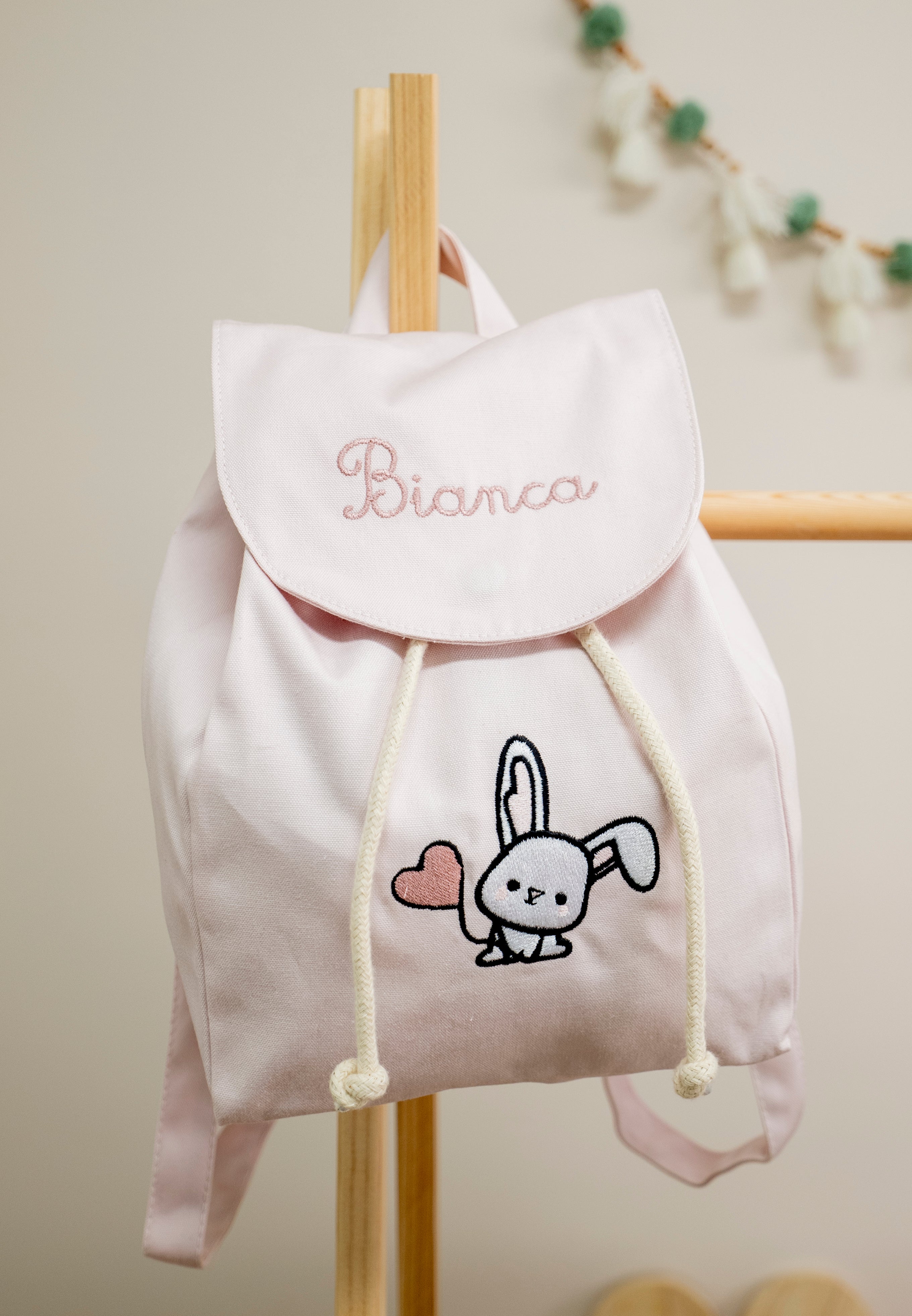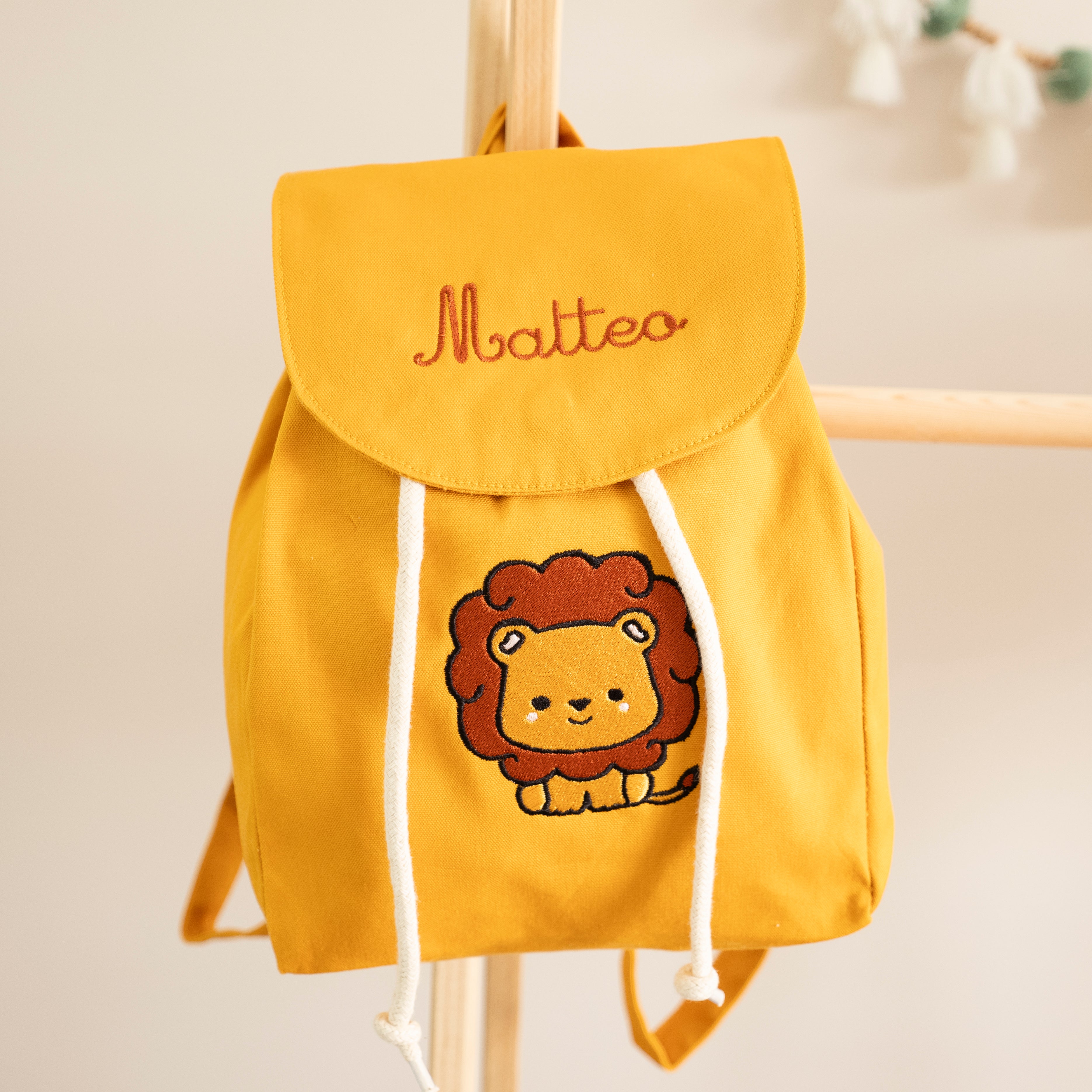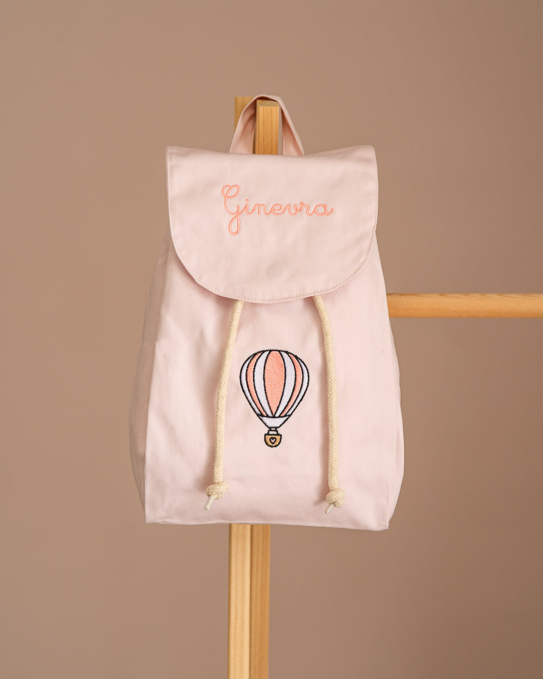 Ogni zaino può essere personalizzato con il nome e il design scelto che viene ricamato esclusivamente su ordinazione in modo artigianale. Il materiale scelto per lo zaino è cotone biologico certificato OCS.